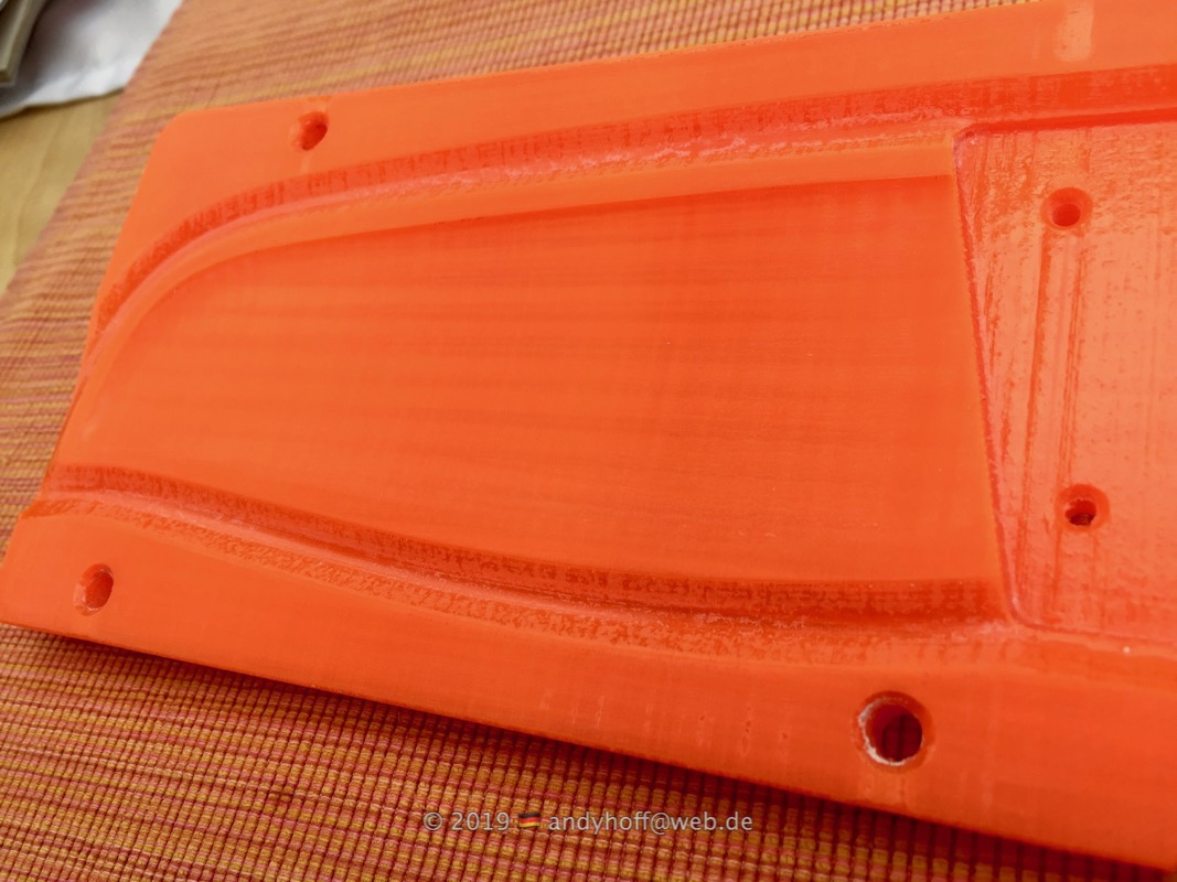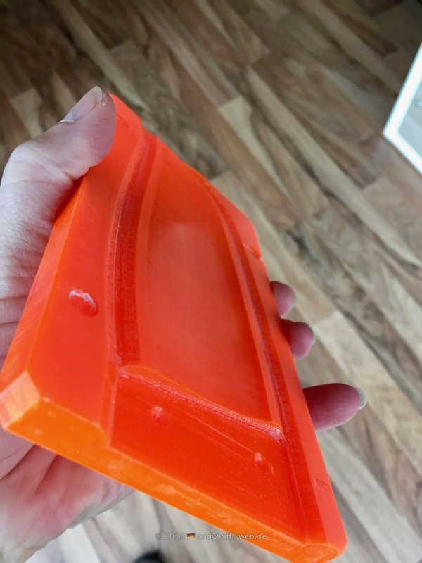 Form ist lediglich 2x mit Harz beschichtet und geschliffen. Dann einige schichten Wachs drauf. Das war es auch schon. Die kleinen orangen Plättchen oben sind nicht mal beschichtet sondern nur leicht geschliffen und direkt mit Wachs behandelt. Wollte sehen ob das Wachs Auswirkungen auf das PLA hat. Bisher schaut alles gut aus.