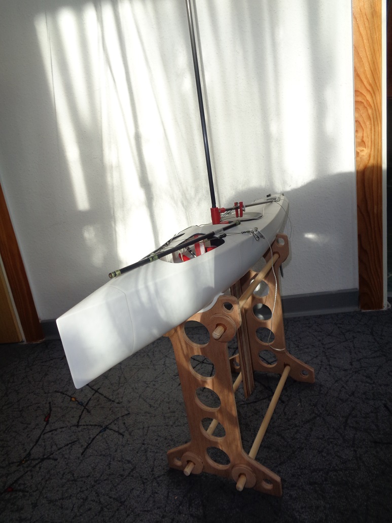 Im Segment des Schwertkastens habe ich noch zwei Stützen, die von der Schwertkastensole zum Decksprung reichen, eingebaut. Das sind ebenfalls Kohlerohre. Damit verhindere ich ein diagonales Verziehen dieses Segmentes. Die Kräfte die durch das Schwert, den Mast und die Wanten entstehen sollten nicht unterschätzt werden.