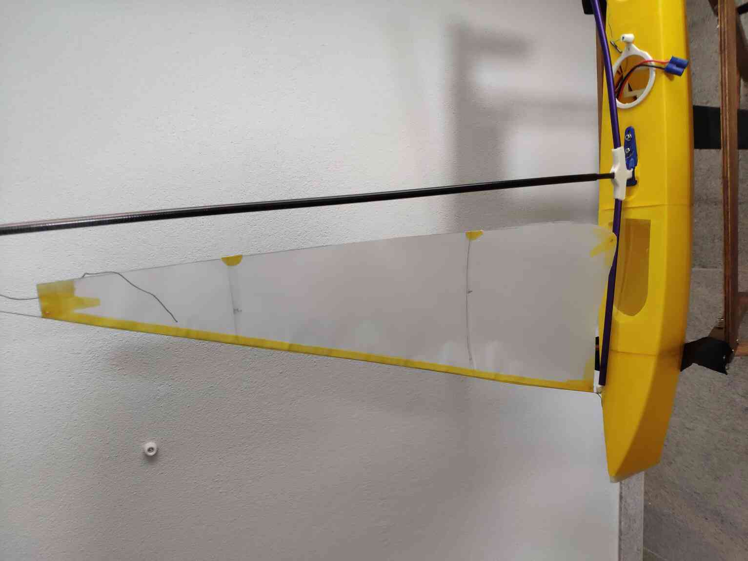 Jetzt kann man die ganzen Krepp Fixierungen entfernen und das Segel umdrehen. Jetzt fängt man von der Mitte her an den Icarex-Streifen umzuschlagen .. und zwar so das beide Hinterkanten Deckungsgleich zu liegen kommen. Durchscheinende Segelfolie ist hier grad zu Anfang hilfreich. So arbeitet man sich langsam von der Mitte nach Aussen... immer die Hinterkante Deckungsgleich ausrichten und vorne mit dem Finger den Knick erzeugen. Das ganze muss man evtl. ein paar mal wiederholen bis sich ein stabiler Knick von etwa 90 Grad ergibt. Dann wird es Zeit auch auf dieser Seite das Doppelklebeband aufzubringen. Also auf das Segel .. mit den Streifen! Dabei das Doppelklebeband Oben-Unten überstehen lassen .. so fixieren wir nebenbei auch gleich wieder unser Segel auf dem Tisch. Jetzt den Knick stärker bearbeiten .. mit einer Rolle oder Daumennagel etc... so das ein scharfer Knick entsteht der nicht mehr viel aufklappt .. also dicht über dem Segel bleibt. Jetzt ist ein guter Zeitpunkt die VL-Schnur einzulegen. Alternativ kann man an der Stelle auch einen Draht einlegen. Der ist für uns ein guter Anhaltspunkt für eine gerade Vorderkante und kann später die VL-Schnur einziehen. Schnur/Draht mit Kreppband/Zwinge fixieren.