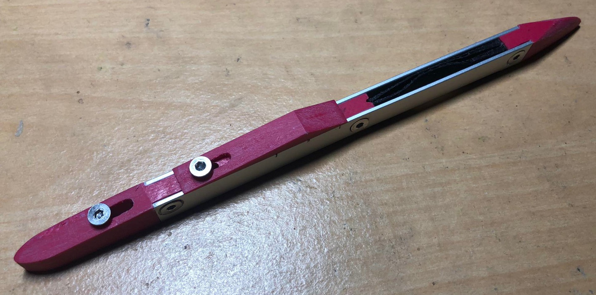 Die mittleren Teile des Halters sind aus PLA+ gedruckt und mit Einschmelzgewinden versehen zum versschrauben der einzelnen Teile. Die Haltestege, die alle Teile des Halter verbinden / zusammenhalten sind aus Alu Material. Für den Bereich der um das Schert kommt habe ich was passendes aus TPU gedruckt um problem- und gefahrlos pressen zu können. Ferner rutscht das TPU nicht so sehr auf der glatten Schwertoberfläche. Das Foil wird dann einfach mit zwei Senkkopfschrauben unter diesen Halter montiert.