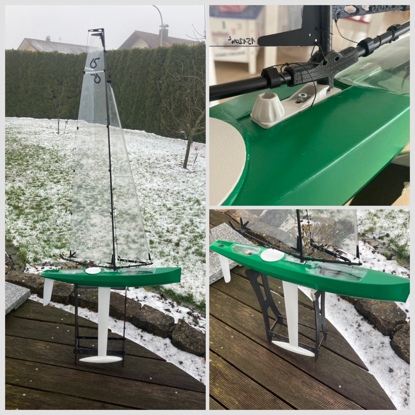 Ich wollte in diesem Projekt meinen Kiel der Krick Modellbau Compass RG65 verwenden, sodass ich mir eine Kieltasche designen musste. Und weil ich einen großen Servo für das Segel nutzen wollte, musste ich mir auch eine Servohalterung hierfür bauen. Auch für den Ruderservo musste ich eine neue Halterung konstruieren, weil der Servo zu hoch ist. Nachdem ich schon eine neue Kieltasche machen musste, wollte ich auch meine vorhandenen Segel verwenden, und änderte leicht die Form des Decks im Bereich des Sliders, sodass ich die Form von Andy Hoffmann nutzen konnte.