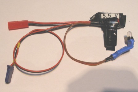 Bild 7 zeigt die 2,54 mm Buchsenleiste in welche der TRACO POWER Konverter gesteckt wird. Auf der Platine ist nur der Trimmwiderstand, der Reedkontakt sowie die Verkabelung zum Akku (roter BEC-Stecker), Empfängeranschlusskabel (blaue Servobuchse) und die vom LED-Saver vorhanden. An dieser Stelle wäre auch eine Variation der Ausgangsspannung mittels Steckbrücke und 2. Trimmwiderstand z.B. für eine höhere Ausgangsspannung zur Benutzung von 7,4 Volt Hochvoltservos (HV-Servos) bei entsprechender Eingangsspannung möglich. Die Eingangsspannung soll laut Datenblatt 2 Volt höher als die Ausgangsspannung sein. Hier ist die Verwendung von 3 zelligen LiPo´s mit einer höheren Spannungslage sinnvoll.