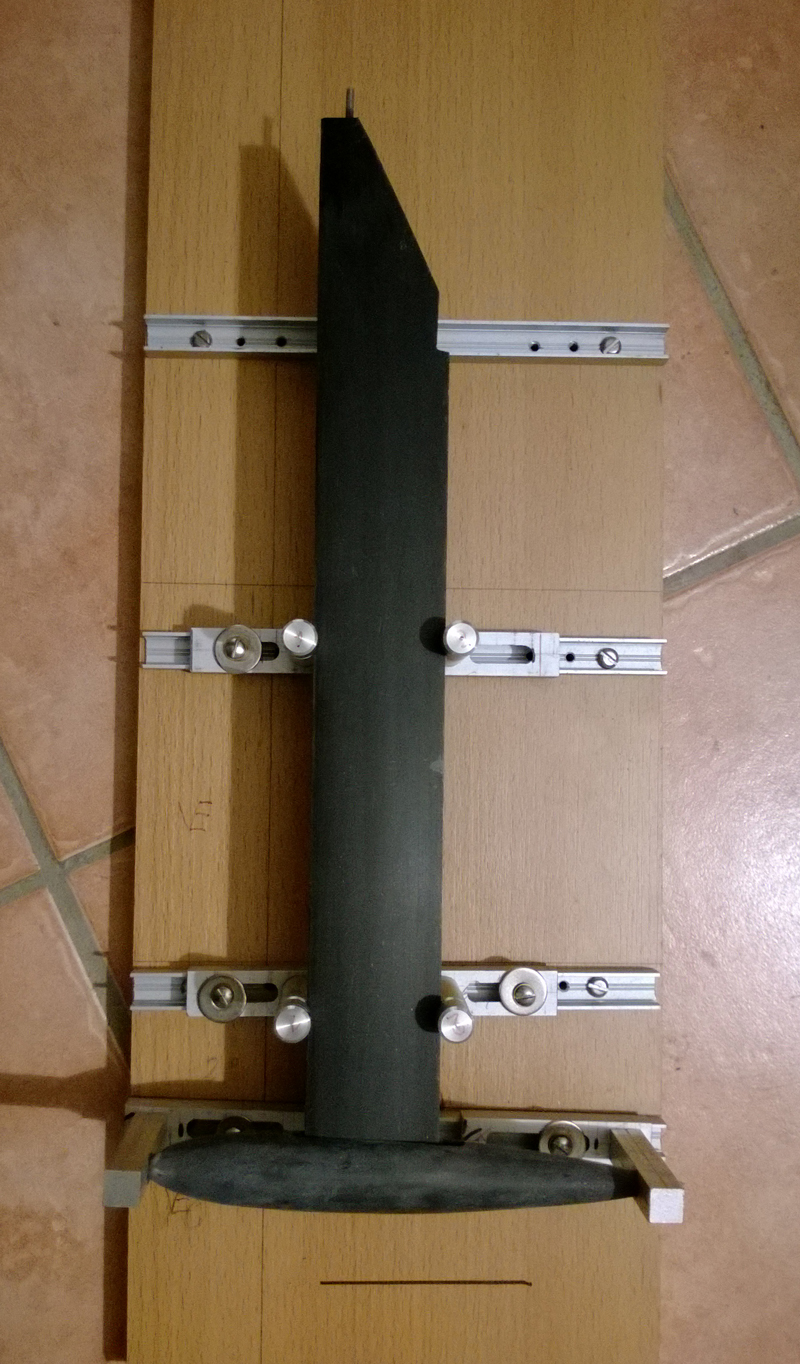 Ich hoffe das Foto ist aussagekräftig genug. Im Prinzip wird die Finne und das Gewicht so fixiert wie man es haben möchte, die Neigung des Gewichtes ist einstellbar.
