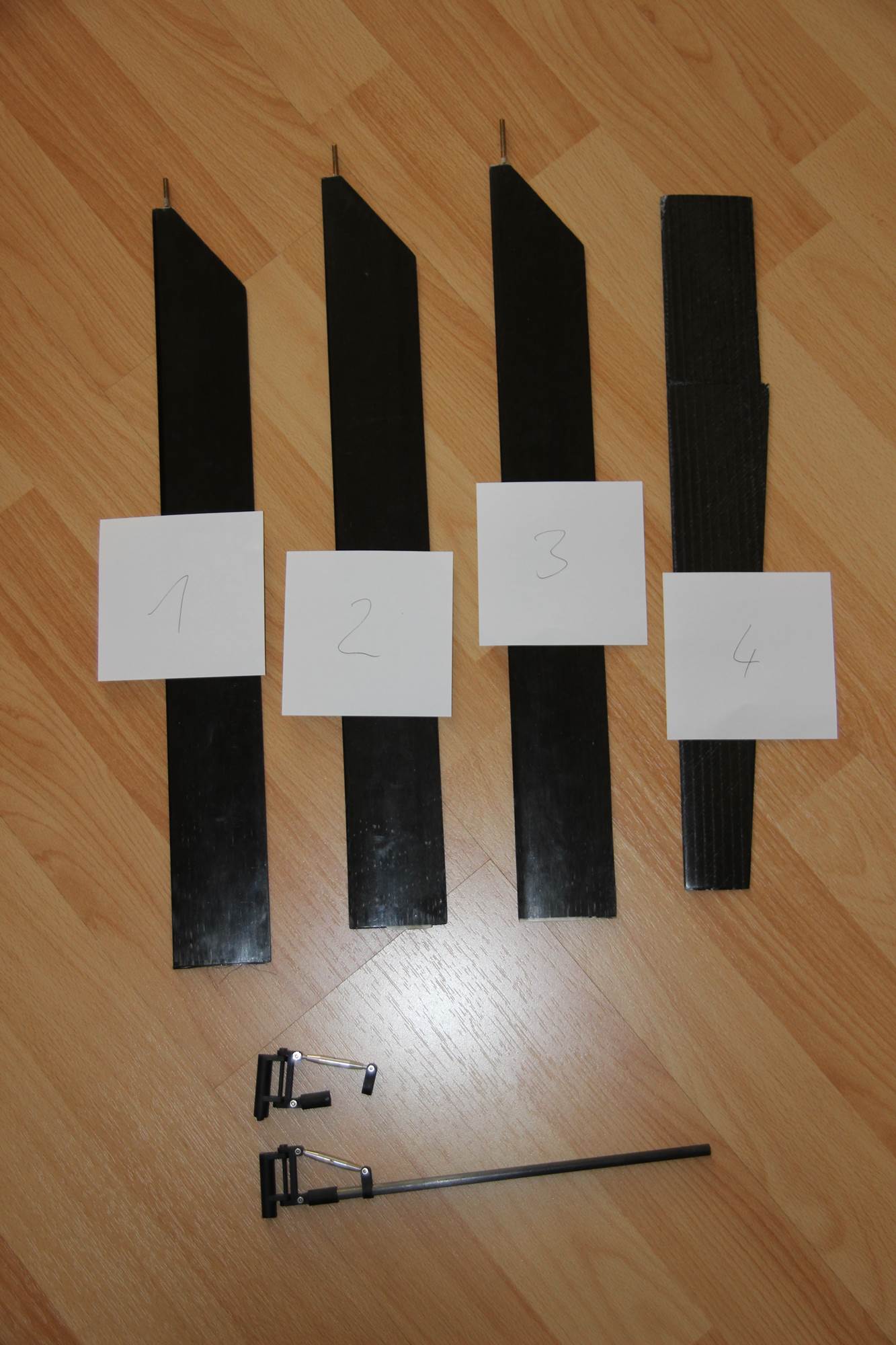Ganz Rechts ist Nr.1 ein Rumpf der "Viperfish" in GFK laminiert aus der Form eines Vereinskollegen. 3x 80g Glas und hat ein Gewicht von exakt 90g. Hierbei ist zu beachten, dass die Mittellinie
