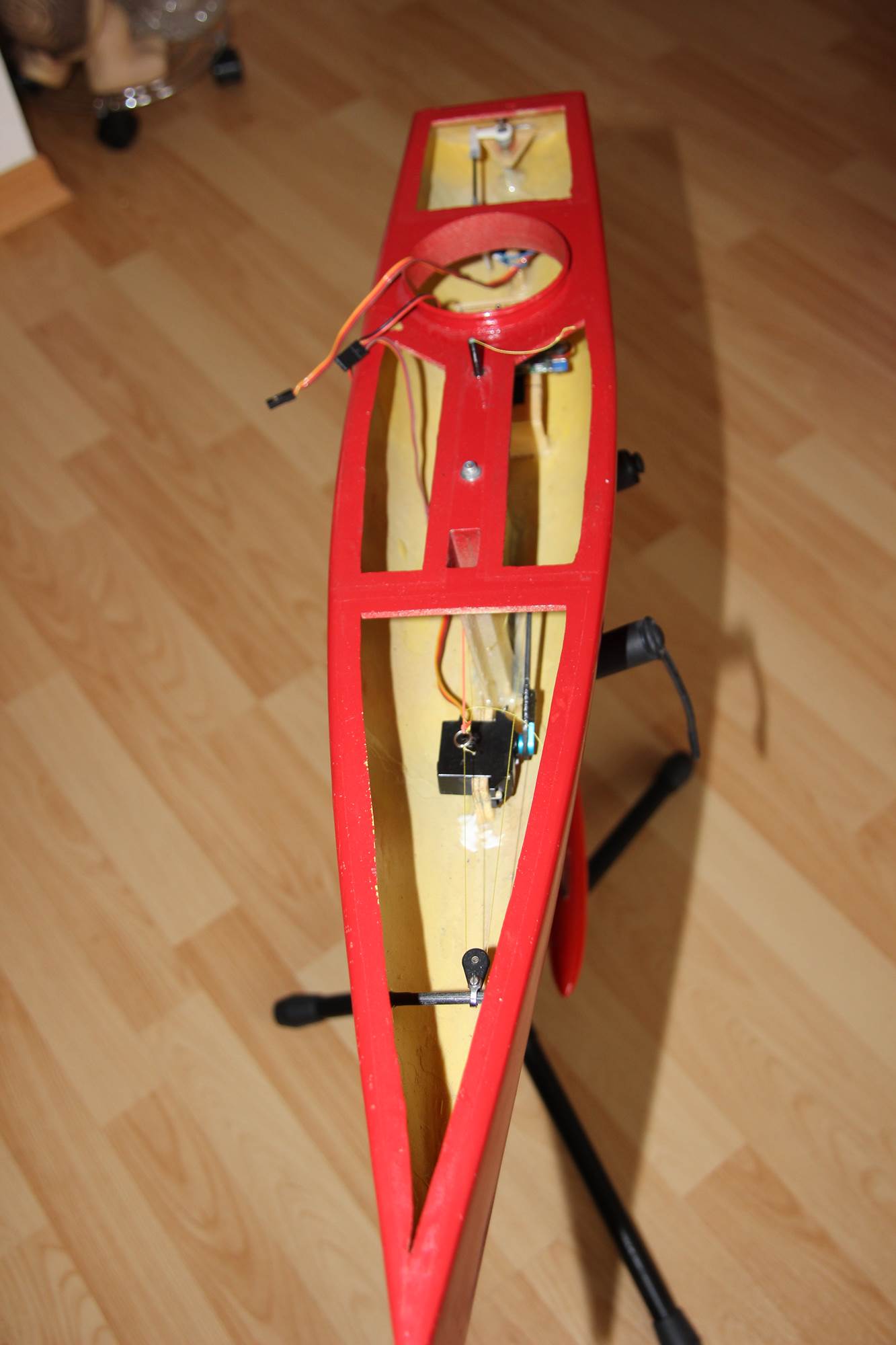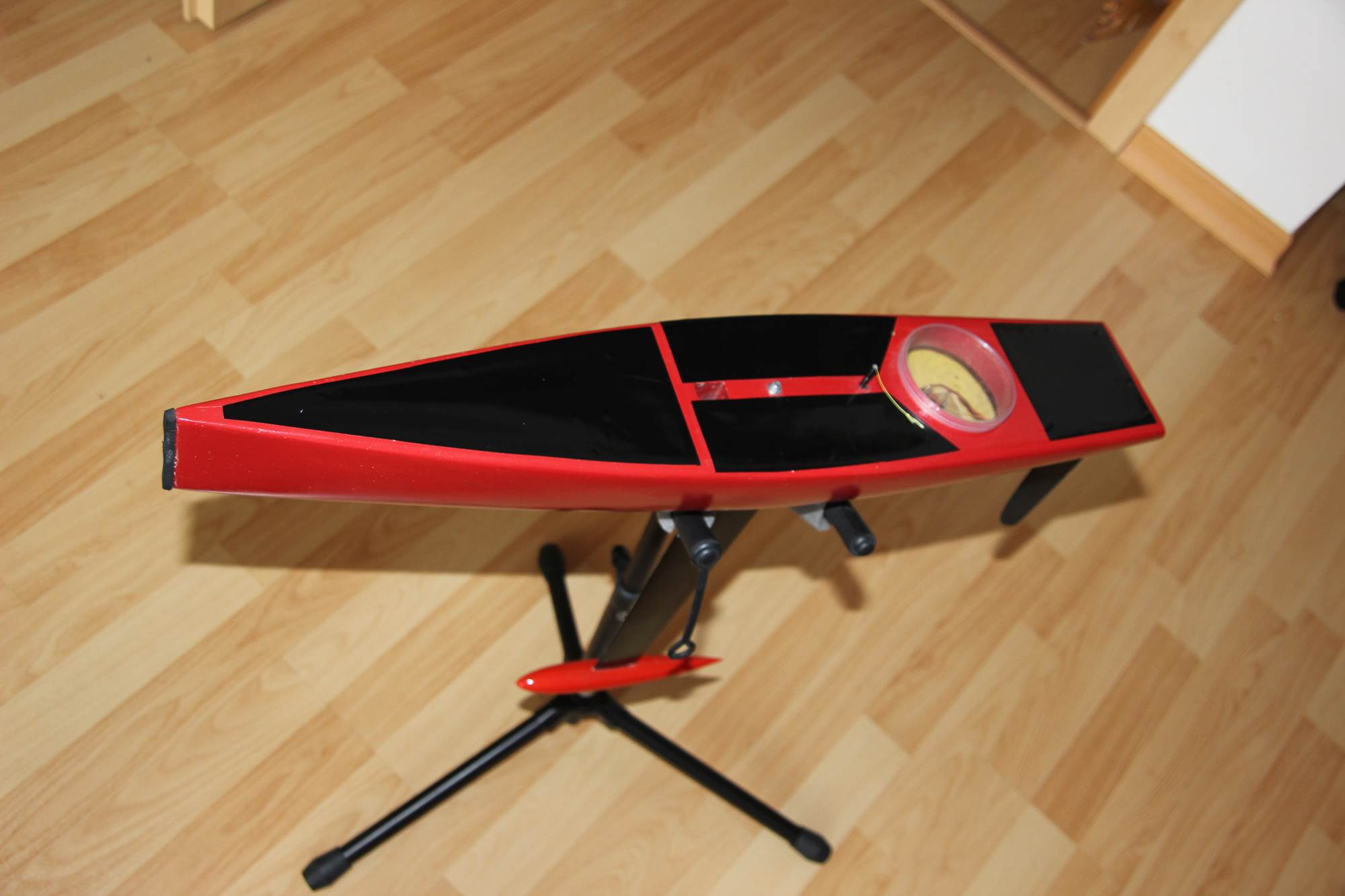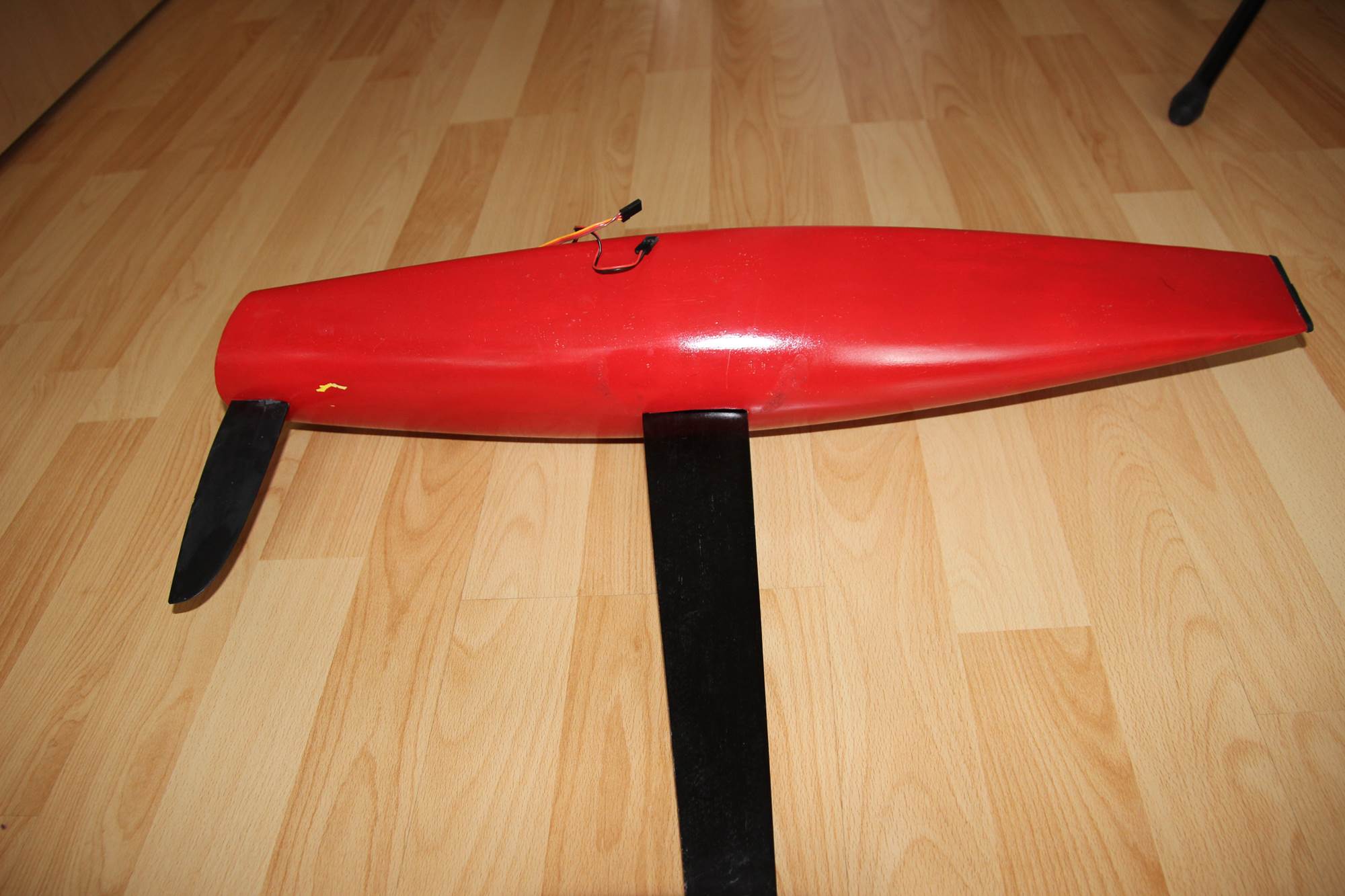 Die Viperfish ist in 3x80g Glas aus einer Form von einem Vereinskollegen entstanden. Sie wurde in gelb eingefärbten GFK laminiert... da dies aber mißlang, wurde sie rot lackiert... Ich bin kein guter Lackierer, weshalb die Lackierung nicht besonders geworden ist... hier und da sieht man das gelbe Laminat und an der Rumpfunterseite sind Lagerspuren zu sehen... Zudem ist mir ein Missgeschick beim entfernen der Deckpatches für Foto´s passiert... der Lack ist abgegangen. Somit muss wohl neu lackiert werden.