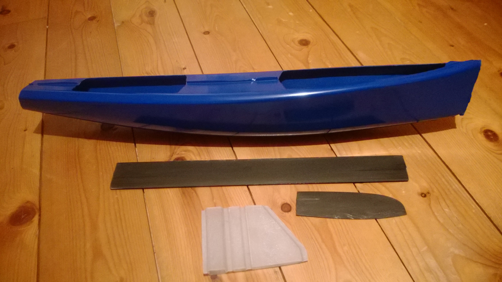 Verkauft wird ein GFK-Rumpf mit blauer Deckschicht (etwas heller als es auf den Foto aussieht), CFK- Ruderblatt mit 3 mm VA Welle, CFK-Finne und eine GFK Kiel-/Masttasche.