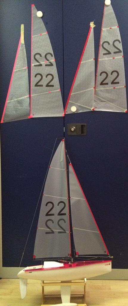 Zusätzlich 2 Segelsätze: einmal gebraucht, Swansails, Design mit Diagonalschnitt, Kopie der Segel mit denen Kym den GMMC gewonnen hat. Einmal neu, Swansails Icarex/Gittermylarmix.