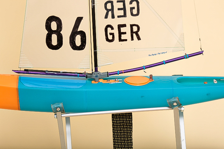 Als Mast wurde ein Sky Shark ll 7PT verwendet. Für die Bäume wurden Pfeilrohre verbaut. Da Mastkreuz ist aus PETG gedrückt und an den Enden verstärkt. Das segelfertige Boot wiegt 970g mit 350mAh 2S Lipo als Empfängerakku.
