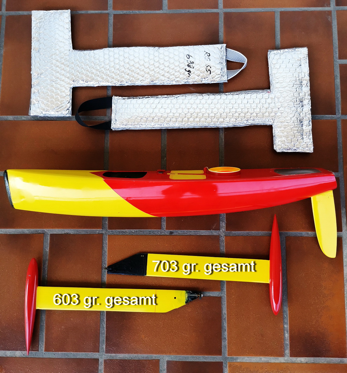 Ebenso zwei Kiele ( CFK ) mit einem Gesamtgewicht von 603 Gramm und 703 Gramm.