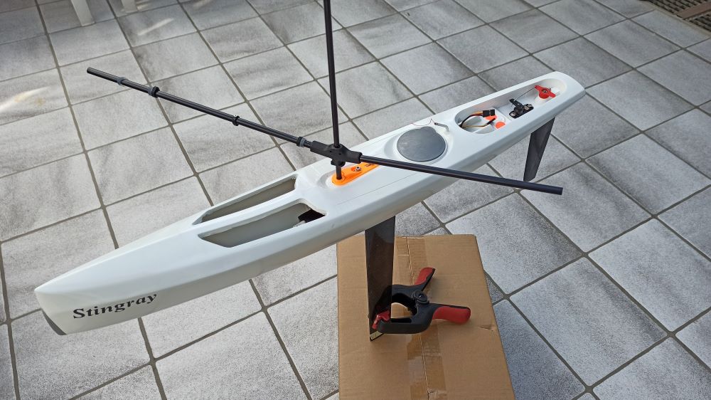 1. Stingray - Material LW-PLA - Rumpf ohne Deck mit Glasgewebe beschichtet - inkl. Finne + Ruder - inkl. Servos (Segelservo Hitec MD 250 - Ruderservo Hitec 5070) - Mastfuß,Mastkreuz und Bäume.