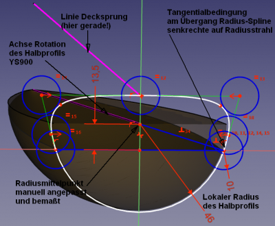 Für eine kantenfreien Übergang vom Bodenradius zum Spline muss dort eine Tangentialbedingung konstruiert werden => Konstruktionslinien blau, Radiusstrahl und Verbindung der ersten 2 Spline-Kontrollpunkte mit senkrechtem Constraint aufeinander. Bei den weiteren Punkten sind Symmetrien sinnvoll.