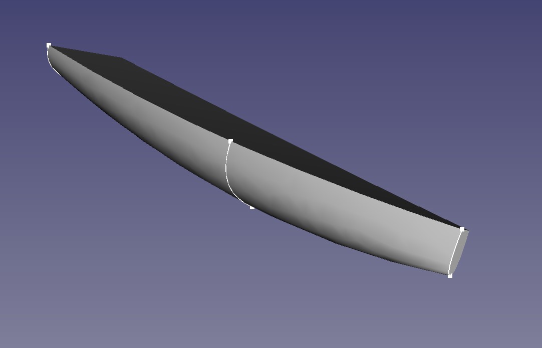 Gordon erzeugt, Fläche gespiegelt, Deck, Kopfspant und Spiegel mit einer Ruled Surface verschlossen und alles zum Solid aufgerüstet. Beim Aufrüsten geht aber das Parametrische verloren. Das passiert beim Lofting nicht. Da mache ich gleich einen Volumenkörper