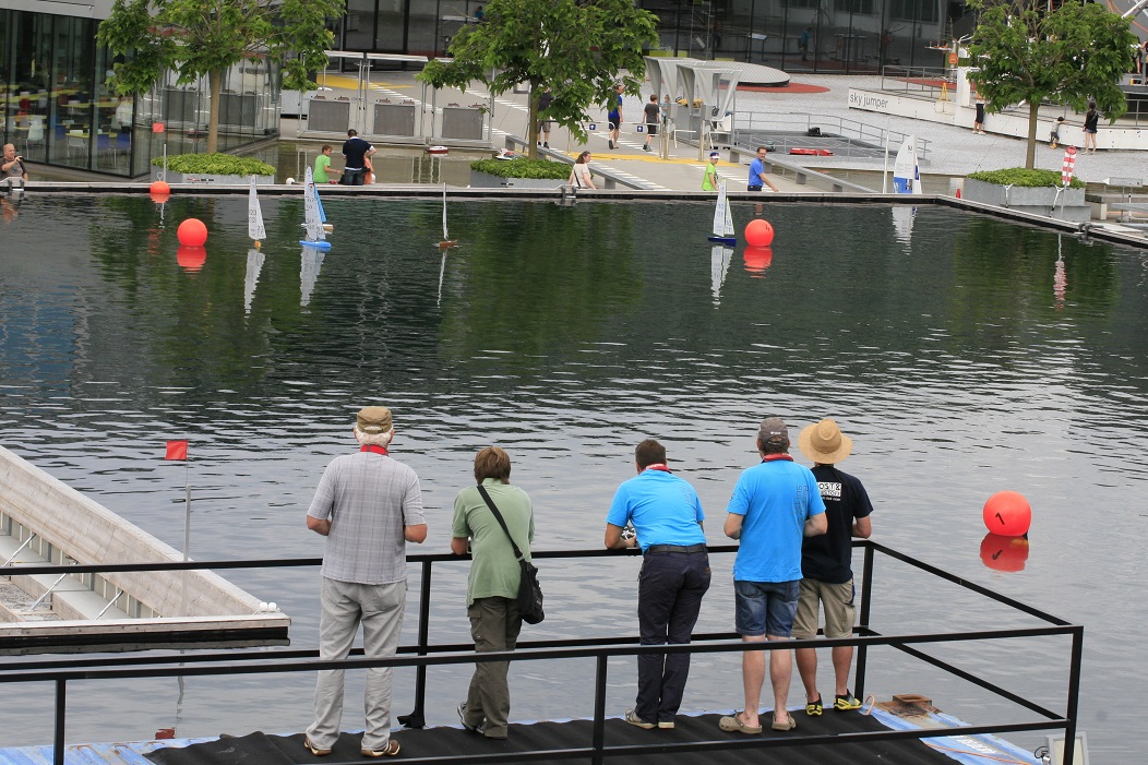 Um 10:30h starteten wir zum ersten Lauf. Die vier Ventilatoren drehten auf Hochtouren und brachten eine schöne Brise aufs Wasser, aber nur wenn es keinen natürlichen Wind hatte, doch dazu später. Diese Regatta zählte nicht zum SwissCup, war aber für uns als Modellsegler dennoch enorm wichtig. Wir konnten unser Hobby einer breiten Öffentlichkeit vorstellen und damit Werbung in eigener Sache machen. Die Mehrheit der Läufe wurde durch den Speaker über Lautsprecher kommentiert damit sich die Zuschauer auch einen Reim auf das was sie sahen machen konnten. Eine gelungene Sache was auch zu diversen Gesprächen mit Interessierten führte.