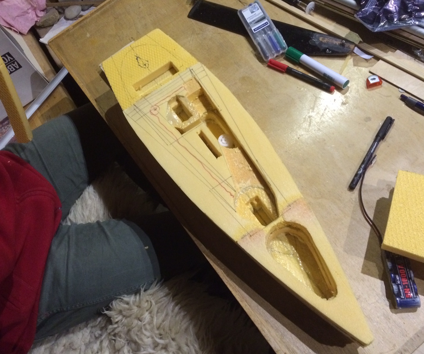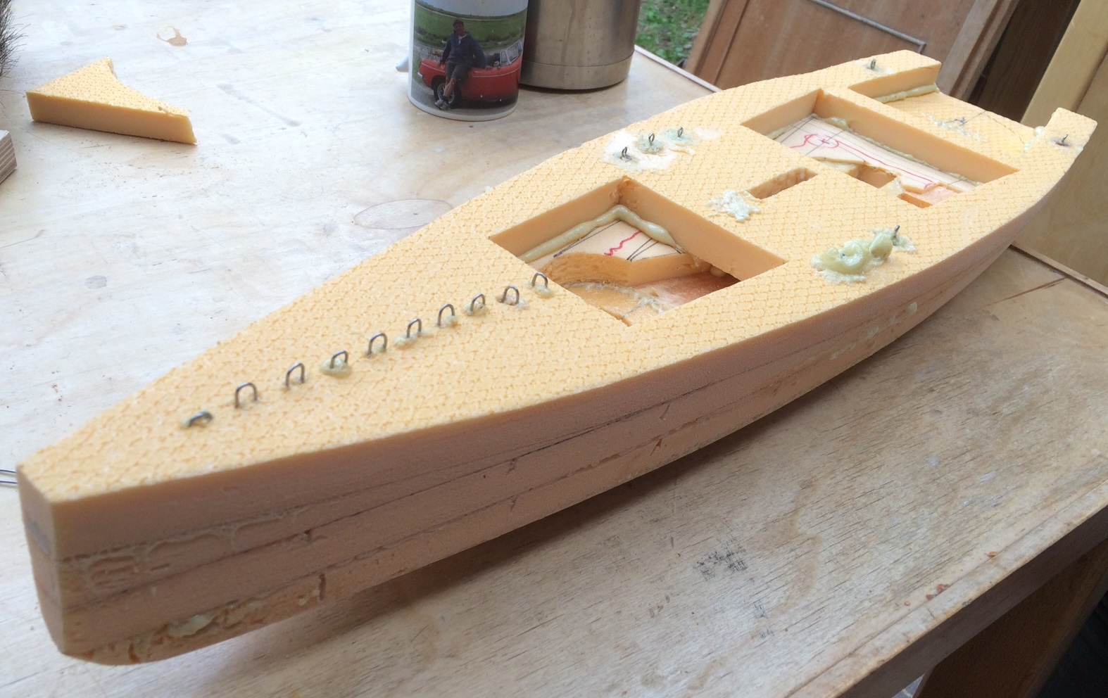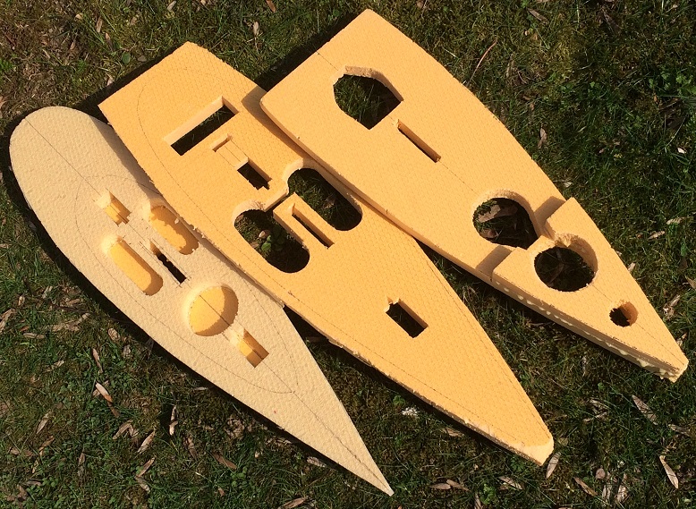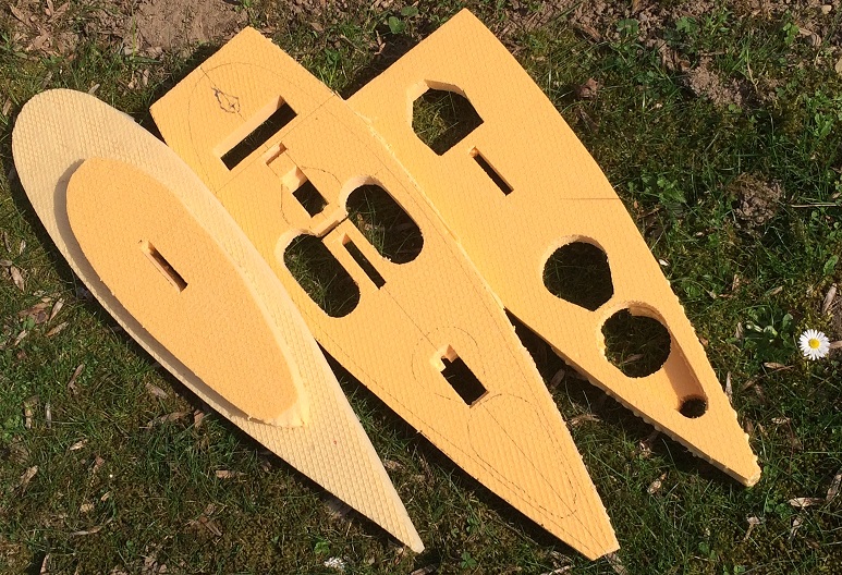 Der Riss wurde auf Dämmschaumplatten übertragen und mit dem Teppichmesser ausgeschnitzt, sodass sich zunächst ein Turm aus Schichten bildet. In den Turm schneide ich gleich Platz für Servos, Empfänger, Akku und Kiel hinein und ergänze den Käse durch einige Gewichtssparlöcher.