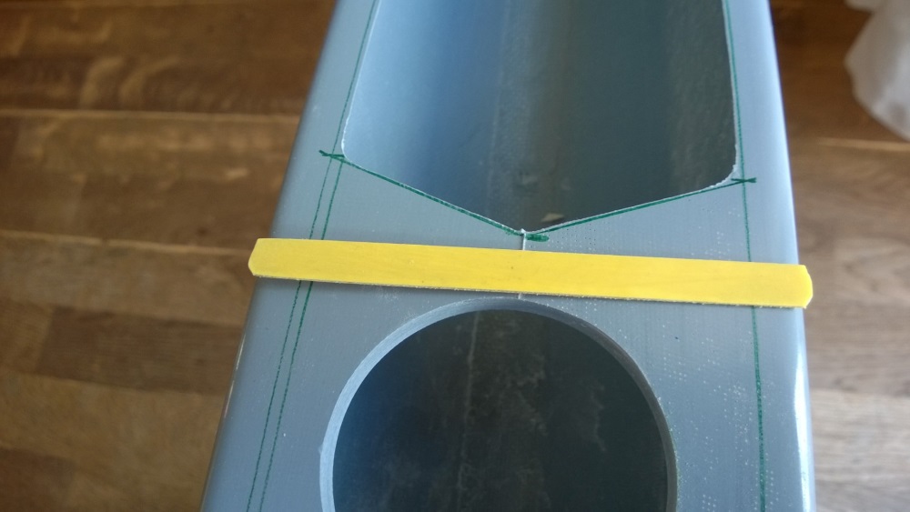 Die Position des Deckels wird angezeichnet und vier Einschnitte bis an den zukünftigen Deckelrand gemacht. Die Klebeflächen werden mit 60er Papier angeschliffen und mit Aceton gereinigt. Der Ring wird mit angedickten Harz eingestrichen und auf richtige Position gelegt. Der Rumpf wird anschließend auf dem Kopf gelegt bis der Harz durchgehärtet ist. Ich fixiere den Ring nicht da ich mehrmals die schlechte Erfahrung gemacht habe das sich dadurch Beulen auf dem Deck abzeichnen. Da der Epoxydharz aber Spaltüberbrückend ist, ist ein klammern o.ä. auch nicht erforderlich. Nach dem durchhärten des Harzes wird das überschüssige Deck entfernt, die Kante sauber verschliffen, fertig.