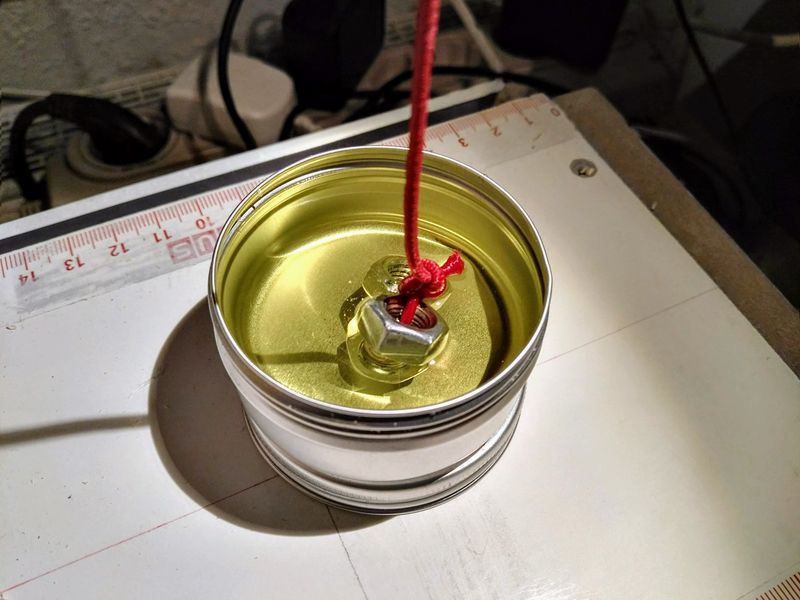 Ich habe dann darüber nachgedacht, wie man das wohl wirksam dämpfen könnte. Die Lösung: Ich tauchte meine Lote (drei zusammen gebundene Muttern) in kleine Döschen mit dickflüssigem Spülmittel (Speiseöl ginge auch) und voila, kein Rumgependel mehr! Simpel, billig und wirksam! So ist mit Loten messen auf einmal sehr einfach.