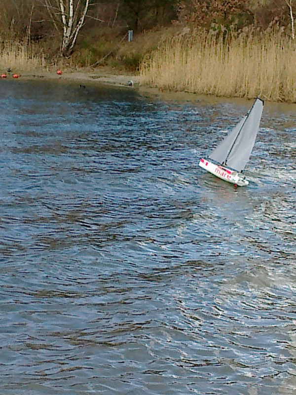 Während Wassertemperaturen, bei denen man nicht hinterherschwimmen könnte, habe ich immer etwas Schiss, mein neues Boot in See stechen zu lassen. Heute war es dann aber noch einmal genug mit auf dem Schreibtisch stehen. Sonne, tüchtig Wind (12-14 Knoten) und eine schöner Badesee mit Wind genau von vorne!