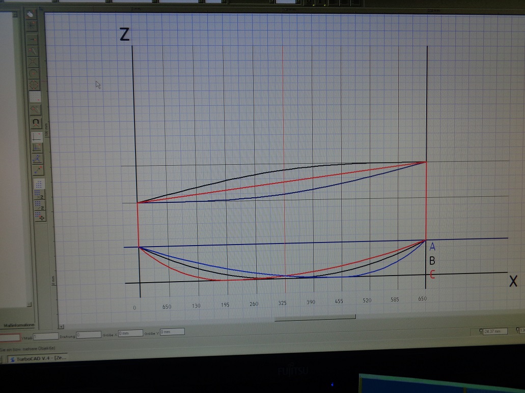 Wie zu sehen ist habe ich auch alle 65mm eine senkrechte Linie für die Spanten gemacht.