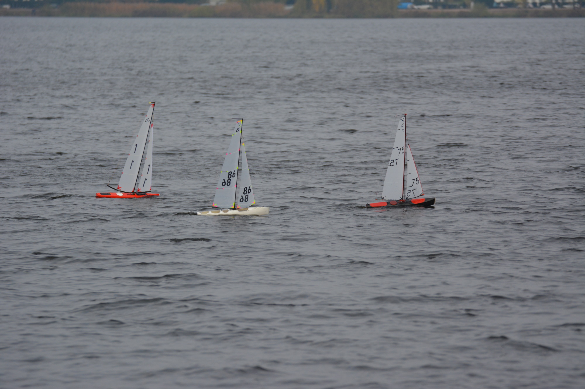 Für heute waren gute 20kn Wind angesagt, also beste Bedingungen um mal mit dem D-Rig ein paar Bahnen zu ziehen. Da mein Bekannter auch mal sein D-Rig testen / einsegeln wollte, haben wir die Gelegenheit am Vormittag genutzt und waren für knapp zwei Stunden am Oortkatensee. Erstaunlich was die kleinen Schiffe trotz des kleinen Segels für eine Geschwindigkeit erreichen und das alles gut kontrollierbar. Der Bug der Orka wird zwar deutlich in Wasser gedrückt funktioniert aber wie er soll. Lediglich wenn die Segel vom Wasser getroffen werden tritt eine deutliche Verzögerung ein. Boot bleibt aber auch dann gut kontrollierbar. Habe jetzt die Mastposition 3-4mm nach hinten genommen. Die Orka sucht sich so etwas besser die Windkante geht aber immer noch gut durch die Wende. Den Starkwindtest hat die Orka somit für mich auch bestanden.
