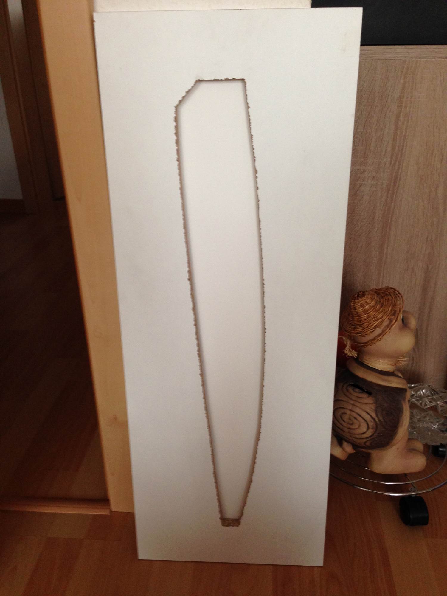 Was habe ich gemacht?! Als erstes aus dem Plan die Seitenansicht ausgeschnitten und auf das zukünftige Trennbrett geklebt. Anschließend mit der Stichsäge ausgesägt...