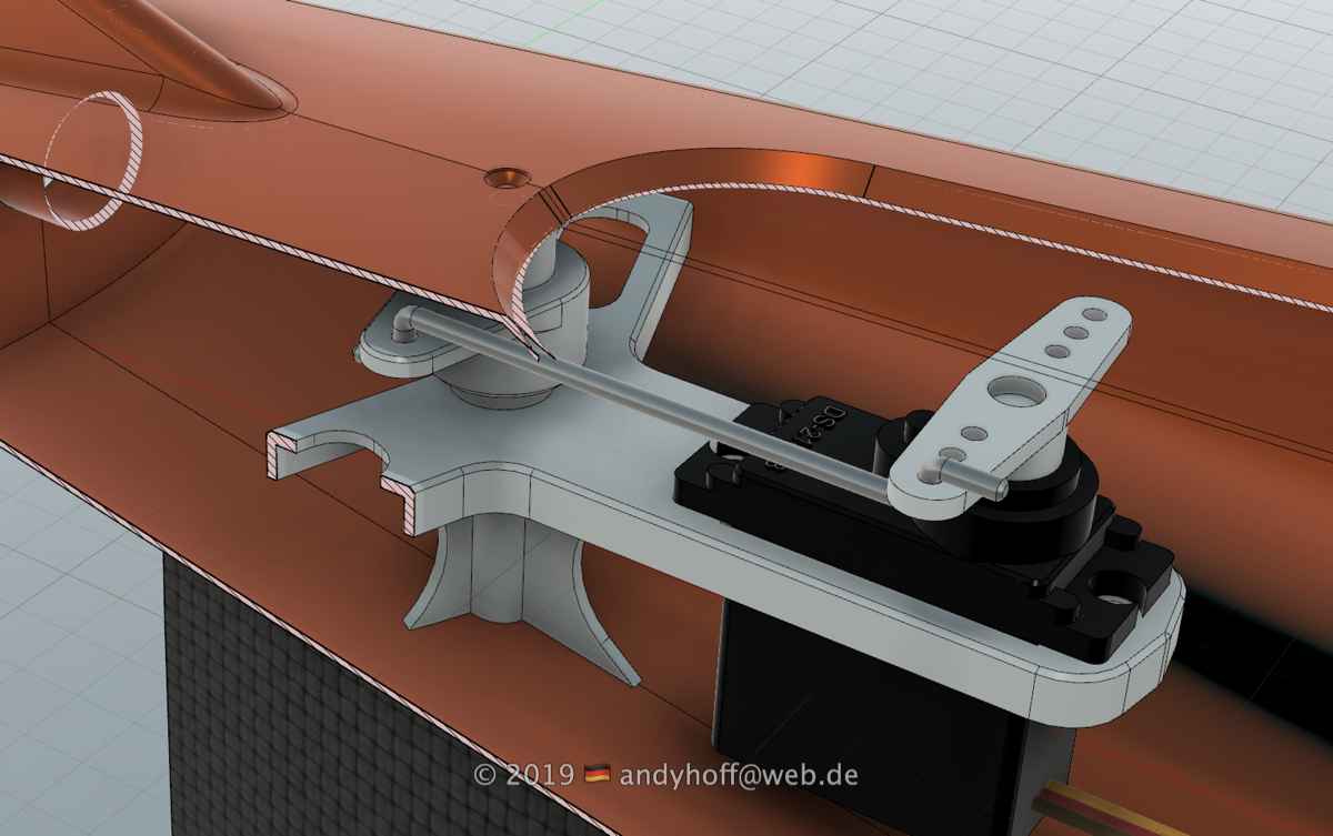 Dafür hat der Probedruck gleich klar gemacht das das Servo nicht so ganz passt wie ich das zuerst vorgesehen hatte. Um derartigen Problemen zukünftig aus dem Weg zu gehen hab ich also gleich mein Servo gezeichnet. Jetzt kann ich das alles perfekt einpassen.