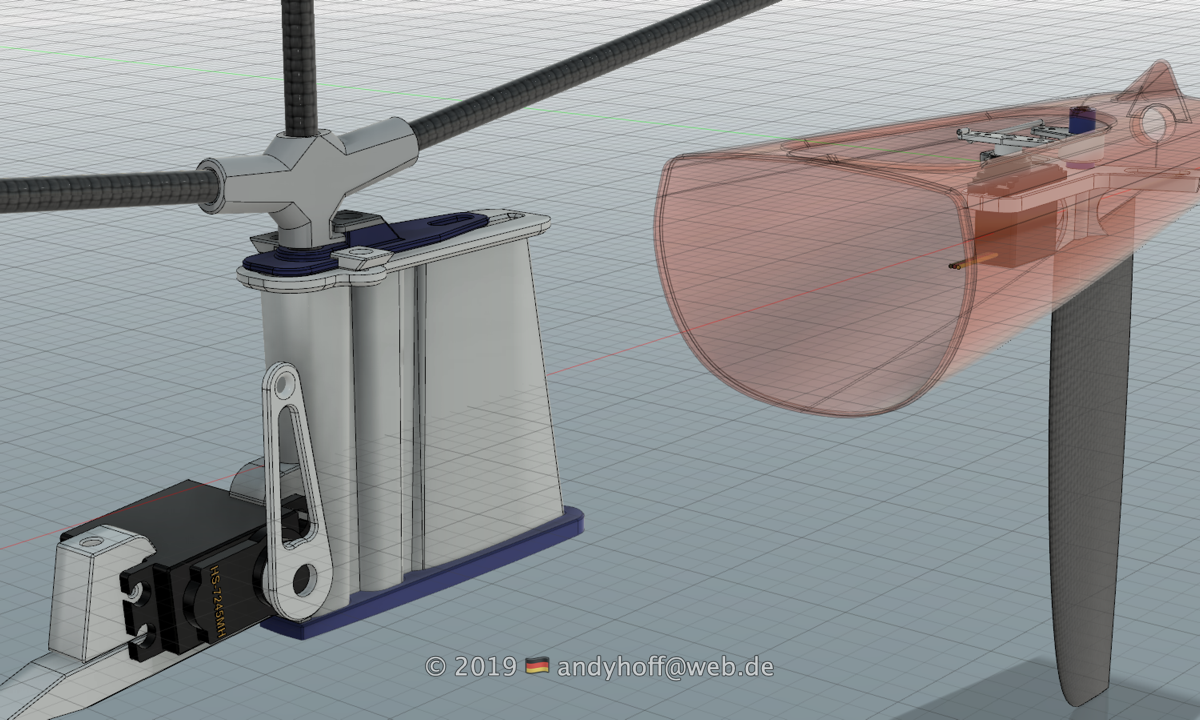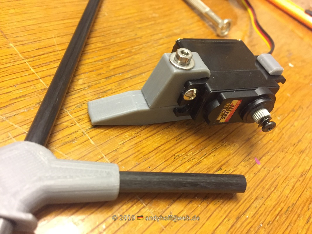 Das ganze ist sehr stabil und passt ausgezeichnet. Servo wird erst in den Halter eingeschnappt und dann mit der vorderen Klammer&Schraube endgültig gesichert. Die kleine seitliche Schraube ist eigentlich unnötig. Aber ich habe dafür trotzdem eine Bohrung vorgesehen.