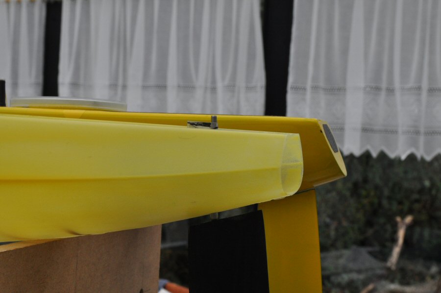 Das Boot liegt auf dem Kopf, Bug und Heck genau in Waage, Kieltasche genau senkrecht fixiert. Die Tasche ist oben geschlossen und wird einfach mit verdicktem Harz unter Deck verklebt. Gleichzeitig lasse ich von oben schon mal mit Kohlestaub gefärbtes Harz in den Spalt einlaufen.