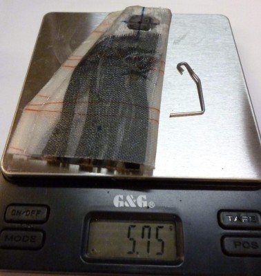 Das erste Ruder ist auch schon in Form gebracht - 0,5mm CFK Platte mit 2x 1,5mm Sperrholz, geschliffen mit einem Bandschleifer 80mm. Kommt auf ca. 20g.