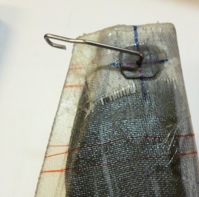 Ein Federstahlstift 1,3mm, so gebogen, dass er unter Spannung hinter die Tasche geklemmt wird.