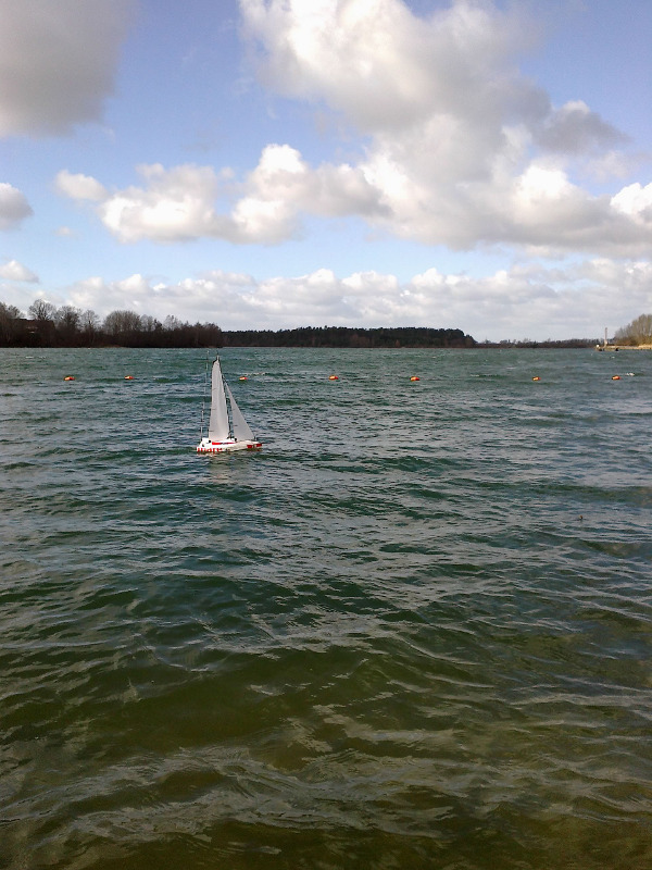 Während Wassertemperaturen, bei denen man nicht hinterherschwimmen könnte, habe ich immer etwas Schiss, mein neues Boot in See stechen zu lassen. Heute war es dann aber noch einmal genug mit auf dem Schreibtisch stehen. Sonne, tüchtig Wind (12-14 Knoten) und eine schöner Badesee mit Wind genau von vorne!
