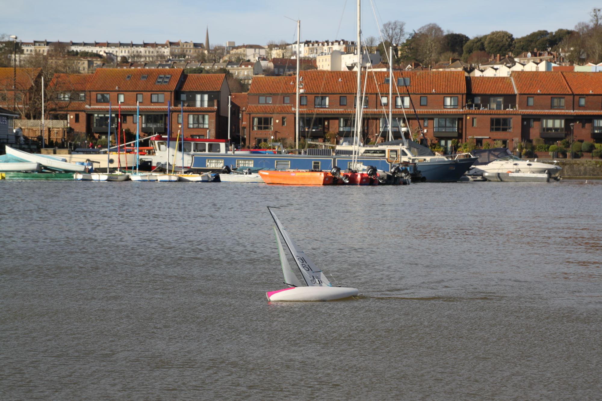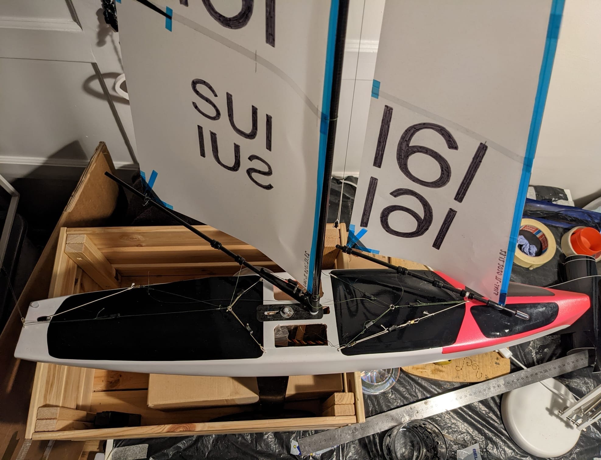 Nun ja, das Boot ist neu und das beste set-up ist offensichtlich noch nicht gefunden. Von meinen Erfahrungen soweit kann ich nur sagen, dass das Boot Vorwind sehr viel Wind verträgt. Das war eines meiner Hauptanliegen mit dem neuen Design. Im Vergleich zur Nuraghe, ist das Boot einfacher zu segeln, also ausgeglichener über einen größeren Windbereich. Aber vielleicht hat der Rumpf mehr Widerstand als einige Kontrahenten, vielleicht habe ich die Breite oder das Volumen im Bug ein wenig zu sehr gepuscht im Design. Das geht mir natürlich Alles durch den Kopf.