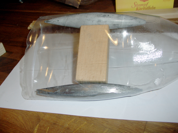 Weil ich meinen Einfülltrichter an die falsche Stelle gemacht hatte, ist eine Hälfte der Gipsform beim ausformen zwangsläufig beschädigt worden. Sonst ist dieses erste Blei aber mit etwas Nacharbeit gut zu gebrauchen. Um die Bleibomben ohne langes Spachteln und Schleifen glatt zu bekommen habe ich Verkleidungen aus PET tiefgezogen: