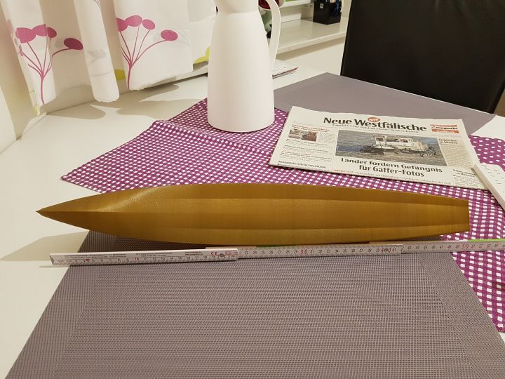 Da drucke ich inzwischen sehr gerne ein 50% Modell. Dafür wird der Rumpf in der Mitte geschnitten. Da man jetzt sowieso im 3D-CAD unterwegs ist bereitet das keinen großen Aufwand mehr. Die beiden Hälften werden dann stehend auf dem Mittelspant im Vasenmodus gedruckt. Beide Hälften zusammengeklebt erhält man schon einen sehr guten Eindruck vom Boot mit den ganzen Details.