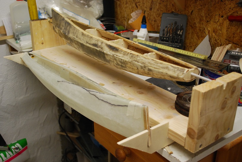 Wird aus Gewichtsgründen ein GFK Rumpf und das ist die fast fertige Form. Hab sie heute noch mit Gewebe überzogen so das sie bei Bedarf noch für mehrere Abzüge hält.