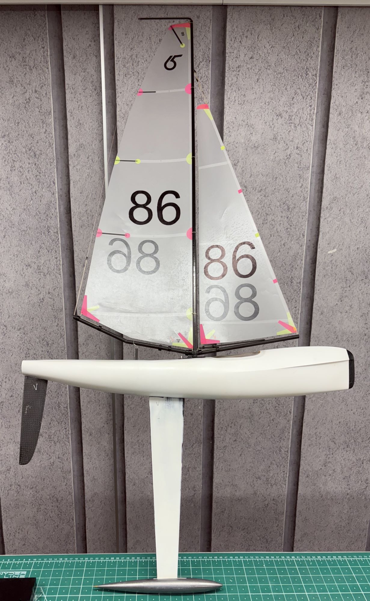 Naja, die Position der des Kielgewichts ist eigentlich durch den Verdrängungsschwerpunkt quasi festgelegt. Man könnte jetzt Segel und Lateralfläche gleichermaßen nach vorne oder hinten schieben. Sehe da aber keinen Grund bzw. Verbesserungspotential wirklich drin. Flossenposition ist jetzt schon so gewählt, dass sie gut mit den Schwerpunkt harmonisieren sollte für eine gute Dreh- / Wendefreudigkeit.