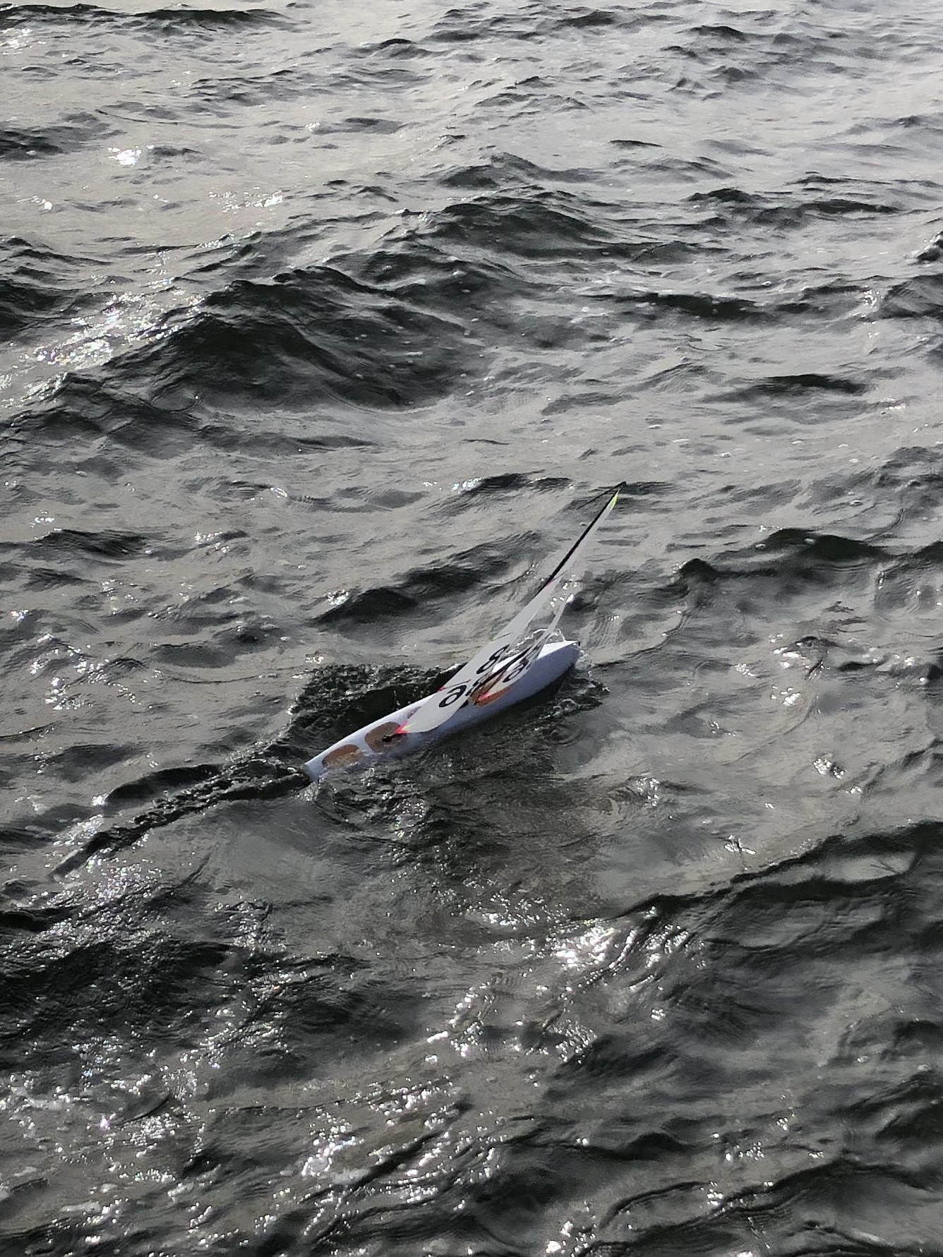 Die Wanderregatta verlief leider nicht so gut. Die erste Teilstrecke gegen den Wind war noch OK. Wenn ich etwas aufmerksamer gesegelt wäre, hätte man noch etwas Zeit sparen können. Die Hälfte der zweiten Teilstrecke Downwind war auch noch OK bis die Orka 4 dann an der Brücke die zu durchsegeln ist in einem Windloch stehen blieb und breiseitig von Bug eines 5kg + Mitbewerber getroffen wurde. Das hält natürliche keine 3D gedruckte RG aus. Glaube auch nicht das eine laminierte aus GFK oder CFK Rumpfvariante das besser weggesteckt hätte. Habe dann noch versucht (fehlerhafterweise) weiter zu segeln bis dann die Technik versagte und der Bug sich dann hob. Die noch vorhandene Luftblase konnte zum Glück nicht entweichen, so dass die Bergung durch das Begleitboot noch rechtzeitig erfolgen konnte.