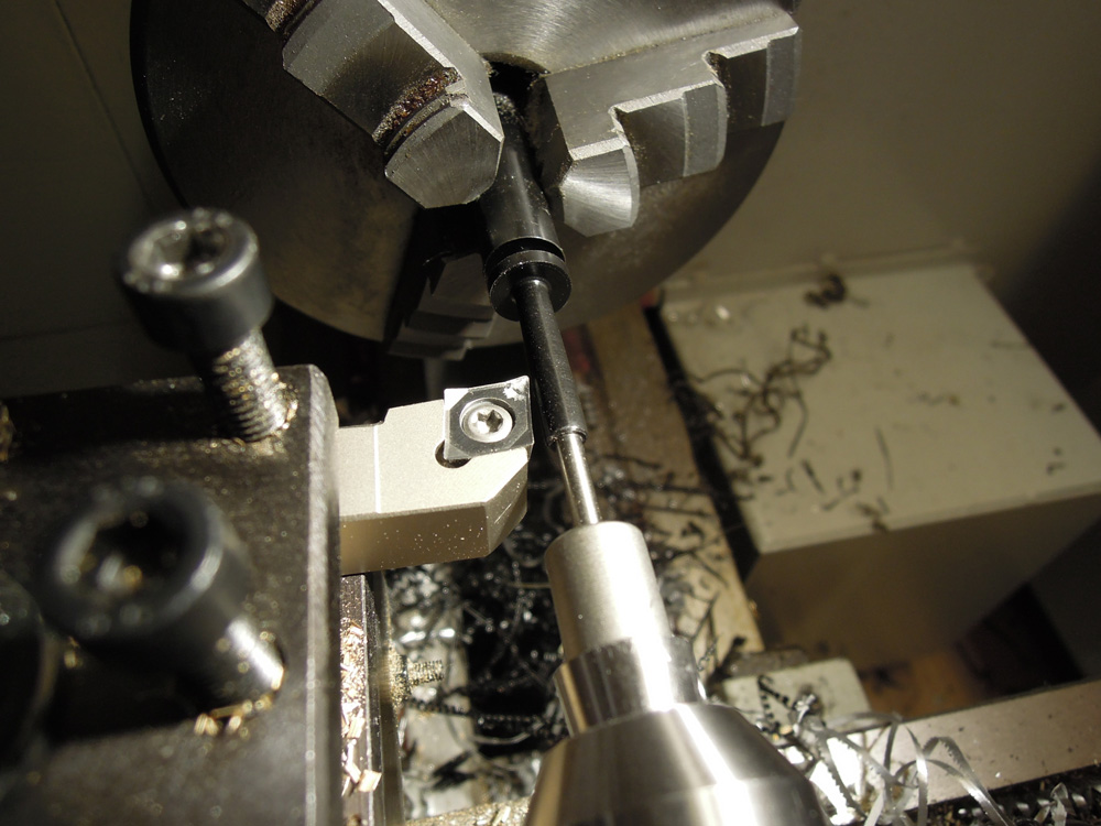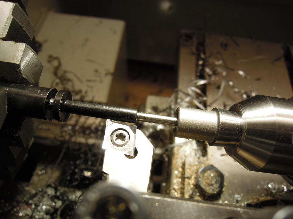 Dazu habe ich einen Rundstab aus POM hergenommen. Leider ist dieser Kunststoff relativ weich und gibt nach. Desalb wird der Koker immer leicht konisch weil der Schneidstahl gegen drückt. Da kann man noch so dünn abdrehen: das hilft nix. Etwas Abhilfe ergab das Abstützen mit der Körnerspitze und einer Achse in der 3,1mm Bohrung. Kennt jemand von euch einen festeren Kunststoff der sich gut drehen lässt? Dabei hat POM den Vorteil einer Art Selbstschmierung, die Oberfläche ist leicht fettig und schmierig. Dagegen spricht die schlechte bis gar nicht gegebene Eigenschaft für eine gute Verklebung. Der fertige Koker geht dann aber in Richtung Extrem-Tuning: er wiegt ganze 0,6 Gramm.