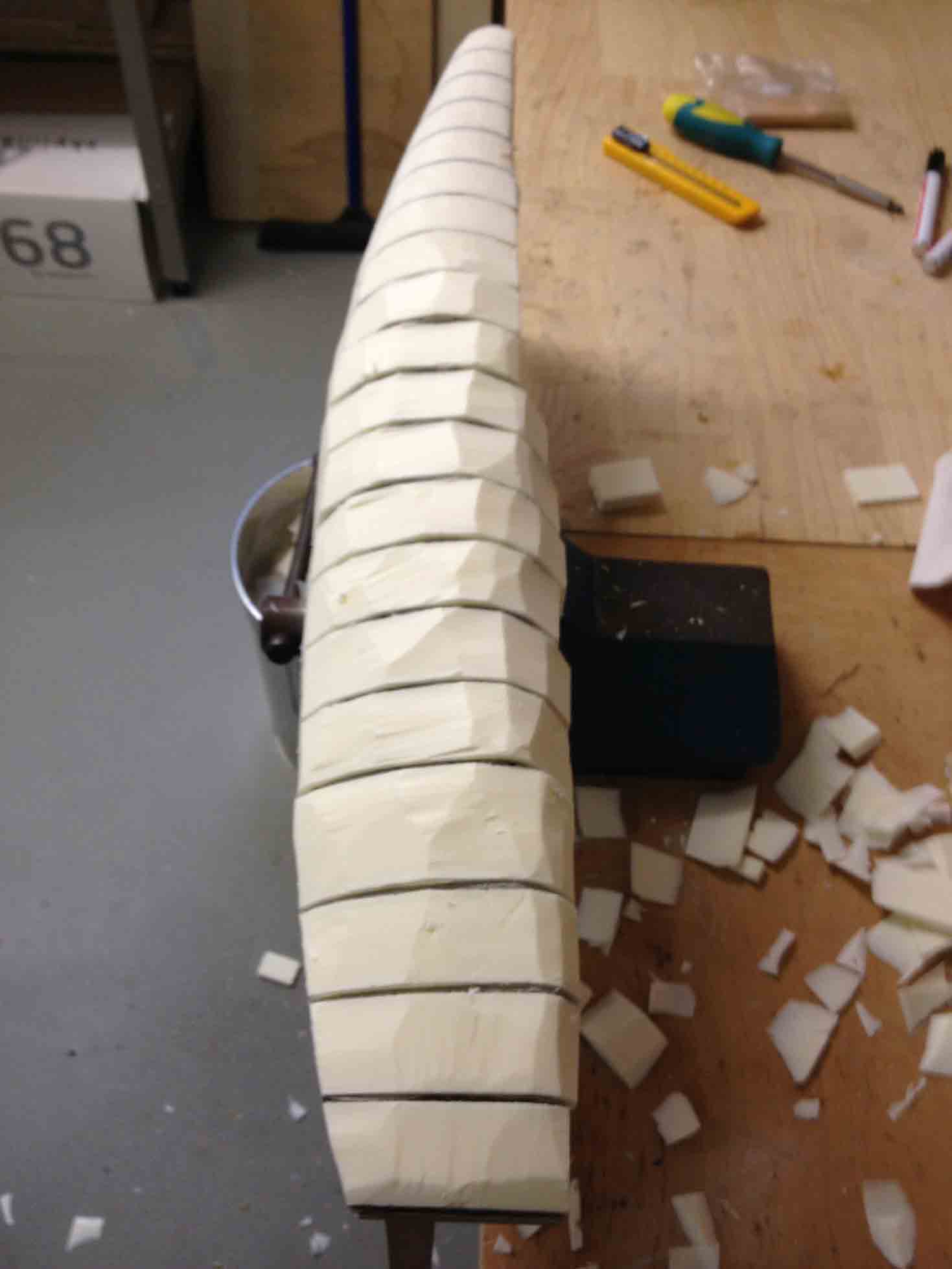 Die Spanten habe ich aus Karton ausgeschnitten, dann eine Hartschaumplatte im Baumarkt erworben (ja, nicht auf der Baustelle gestohlen!
