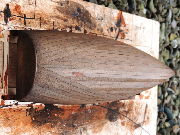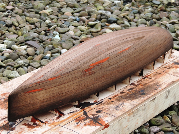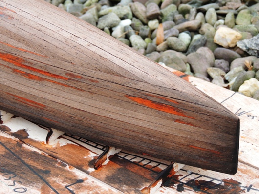 Genau so wenig habe ich daran gedacht, dass ich die Planken sichtbar lassen könnte, sonst hätte ich sicherlich mehr darauf geachtet, dass die Lücken nicht so klaffen! Und ich hätte sie vorher gebeizt und nicht erst auf dem Rumpf - obwohl ich diese komischen roten Macken eigentlich ganz interressant finde.