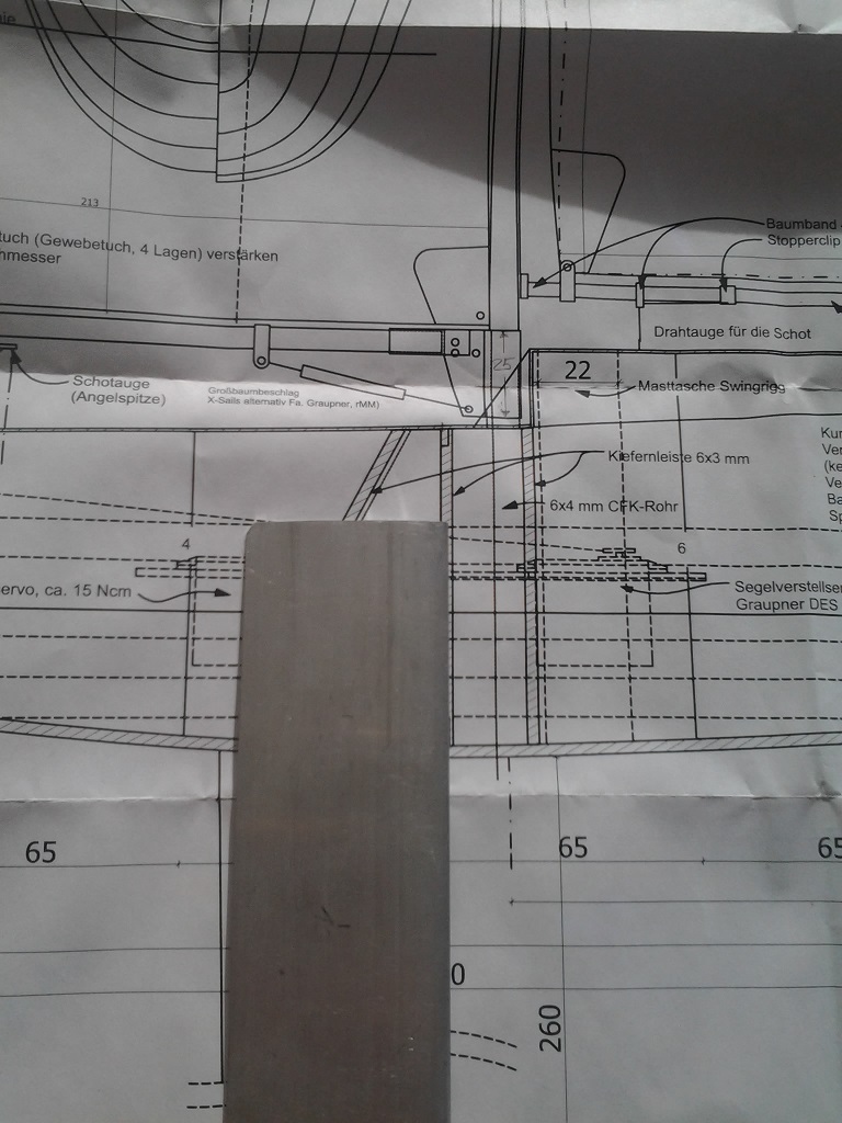 die Finne unbedingt bis kurz unter Deck laufen lassen. Die Tasche ist nicht dafür ausgelegt seitliche Kräfte aufzunehmen, das geht nur über den Rumpf bzw. Deck. Die eingebaute Kieltasche entspricht nicht der im Plan gezeichneten, also nicht einfach die Finne anhand der Zeichnung anpassen ;)