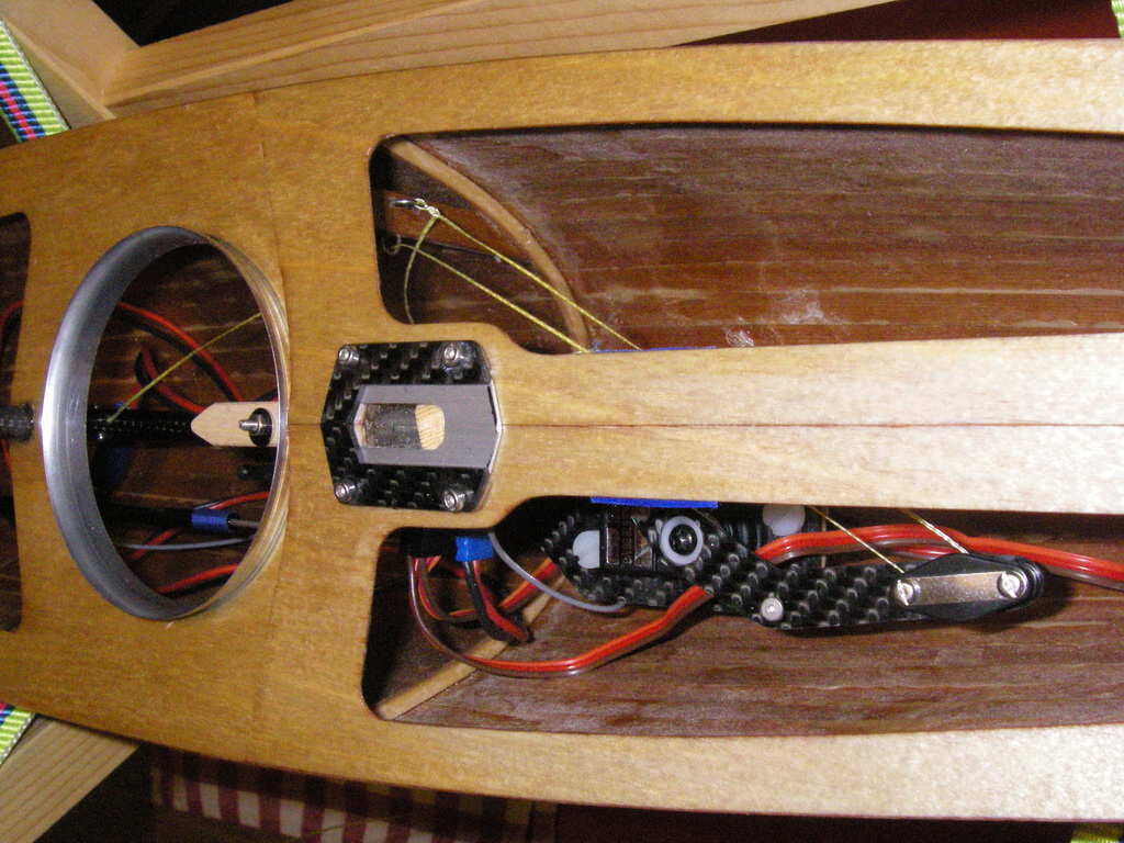 Das Aluplättchen kann nach Hinten geschoben werden, auf dem Mast sitzt ein Alukragen, welcher zugleich auf dem Kugellager sitzt. Zur Sicherheit wird das Karbonplättchen noch mit dem Deck verschraubt.