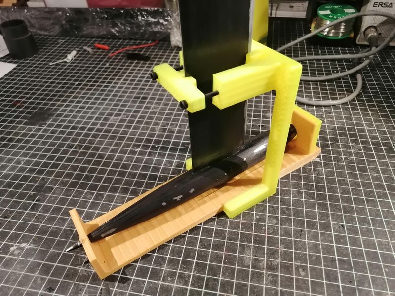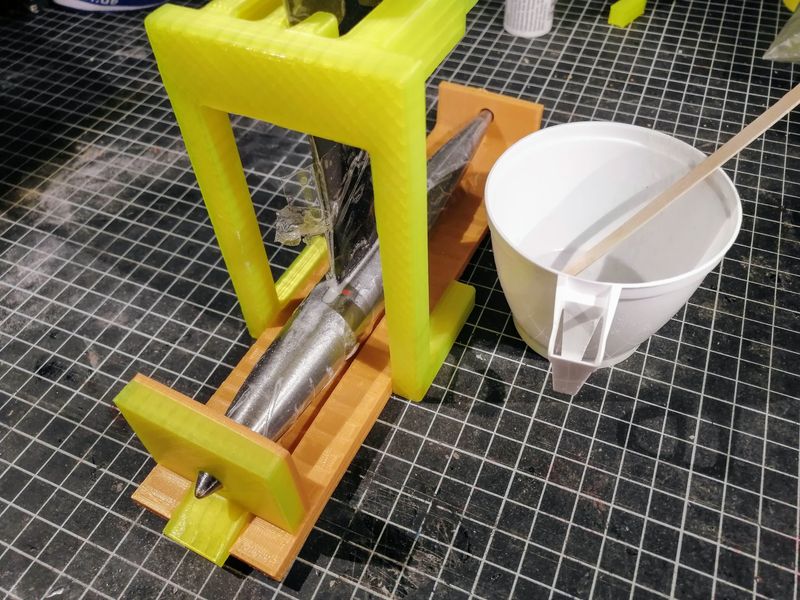 Hier sieht man die perfekte Vorrichtung zum verkleben von Blei & Schwert. Super gebaut von Manfred! Das schöne Teil nutze ich heute noch. Einen ähnlichen Ansatz sollte man heute mit gedruckten Teilen sehr viel einfacher umsetzen können.