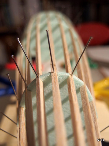 Auch zu sehen, die teils im Boot verbleibenden Spanten sind aus Depron-Laminatunterlage mit