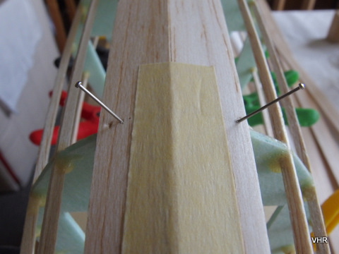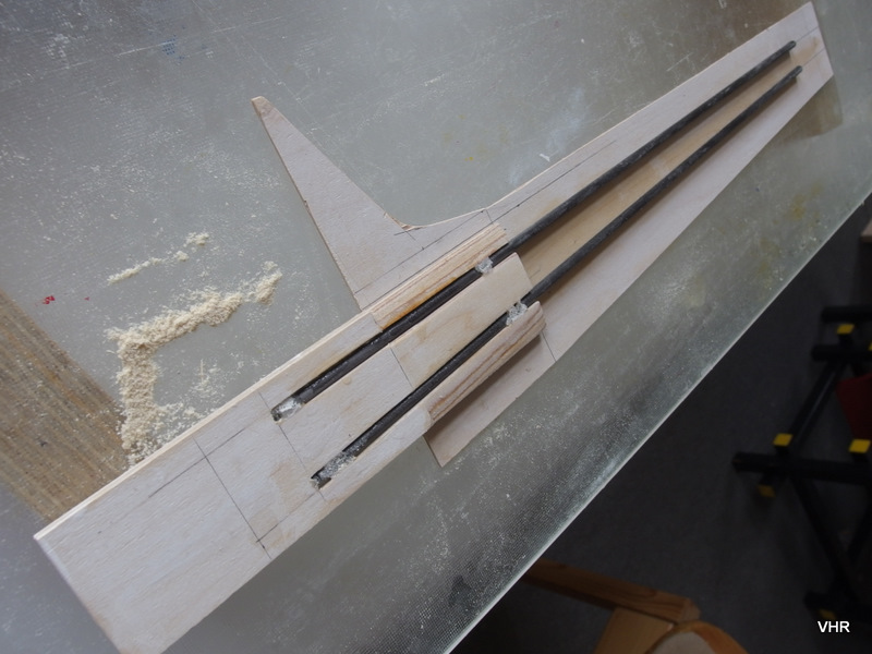 Die Längsstringer sind 2x3mm Balsaleisten. Verklebt wird da ganze mit PU-Leim, der fugenfüllend leicht aufschäumt und ausgehärtet gut schleifbar ist.