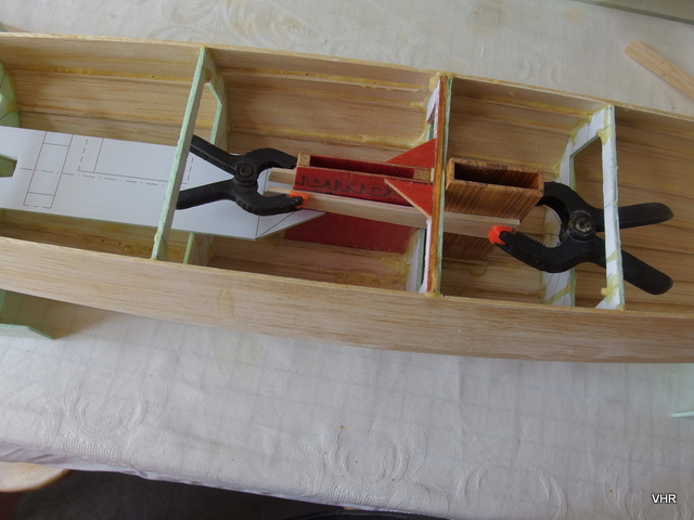 Das Vordeck - aus vier freeship-Planken- wird über verlorenen Spanten verleimt.