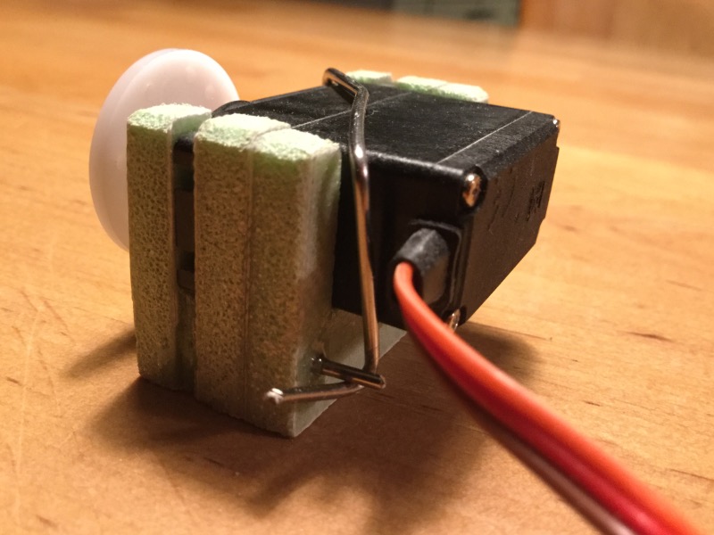 Den Drahtbügel würde es wahrscheinlich nicht benötigen. Das Servo wird durch die rauhen Oberflächen geklemmt und gehalten. Das Gewicht beträgt 4gr. Wenn jemand ein Plänchen haben möchte, einfach melden.