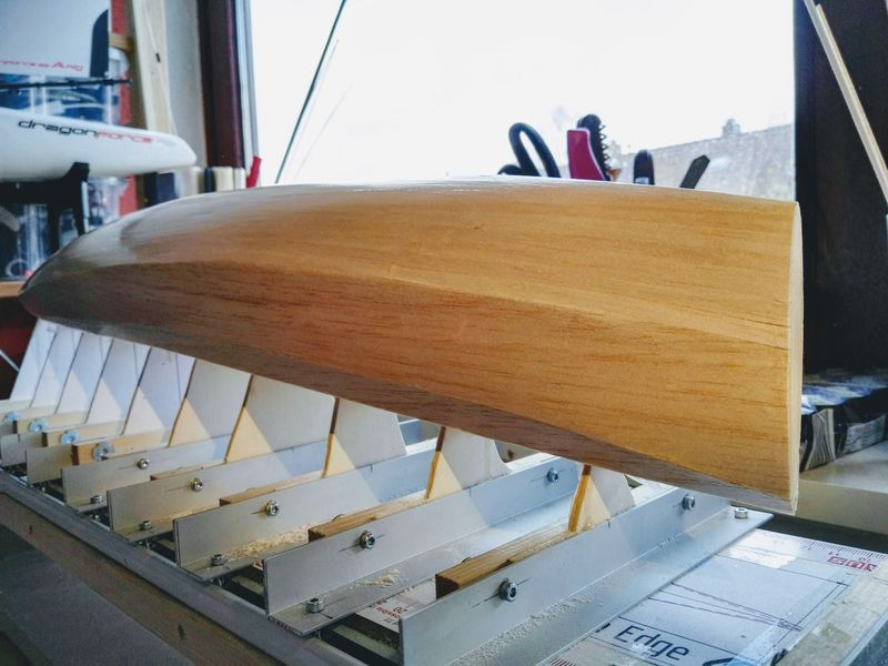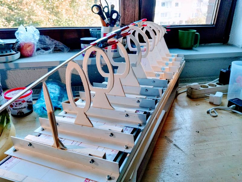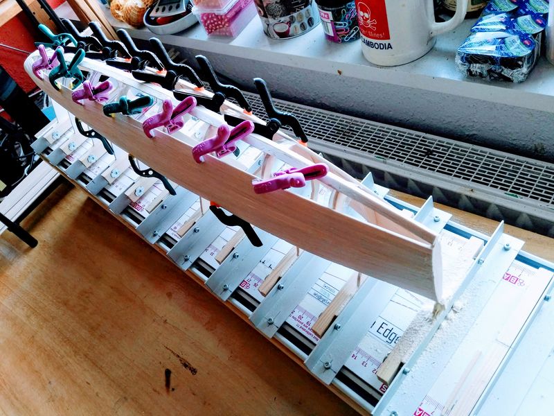Es ist vollbracht! Die ersten Schritte zum selbst gebauten Boot sind getan und nun stehen die Spanten schön ausgerichtet auf Helling. Wie schlank das Teil doch im Vergleich zu meiner DF ist!