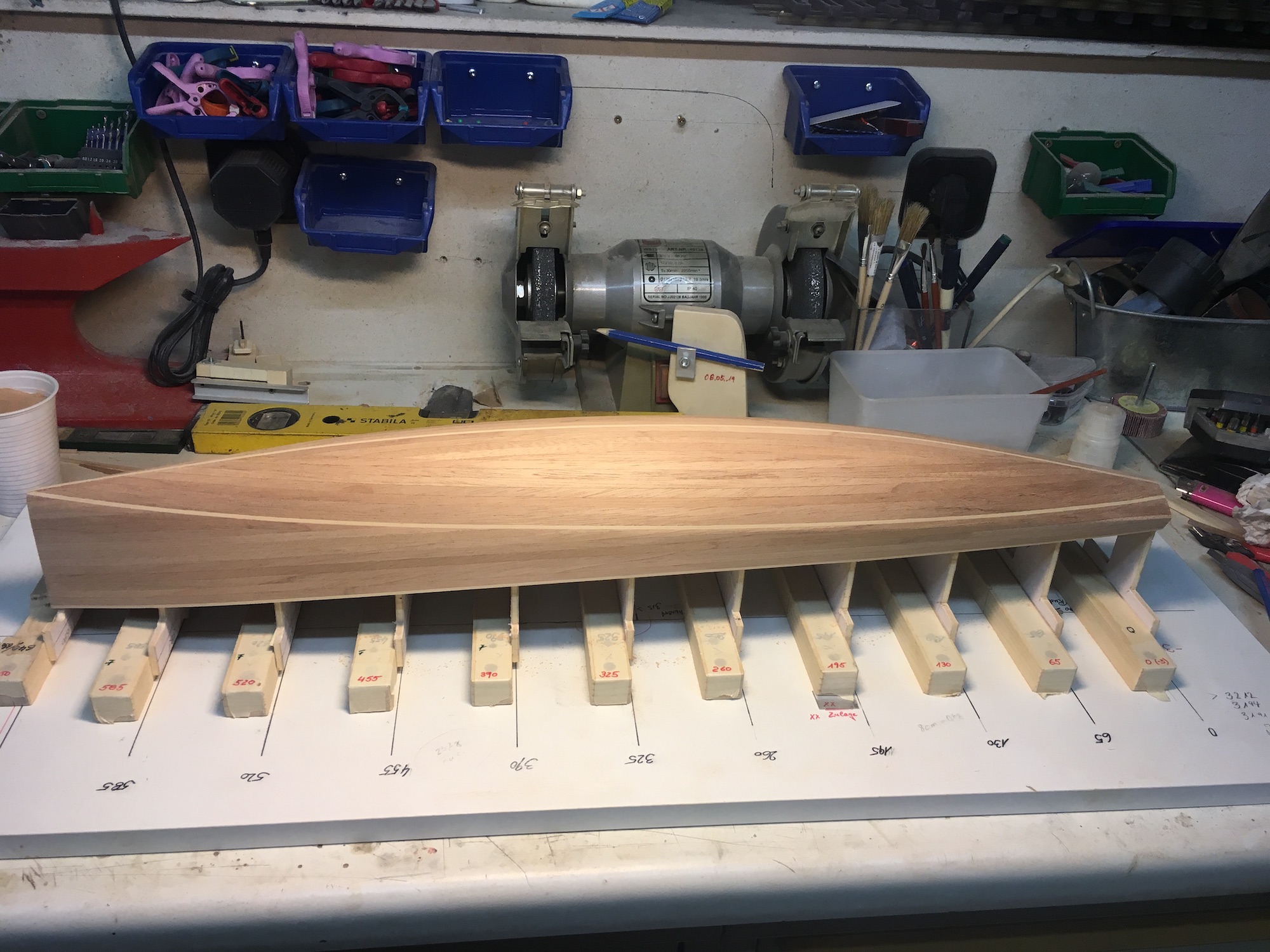 Es ist halt mein erstes Boot, welches in dieser Technik entsteht. Dafür habe ich den Helling nochmals komplett zerlegt und alle Spannten überarbeitet, sprich deutlich dünner geschliffen. Das Ergebnis, überschaubare 15g mehr Gewicht, für die Spannten. Das kann ich sicherlich an anderer Stelle, zumindest teilweise, wieder einsparen.