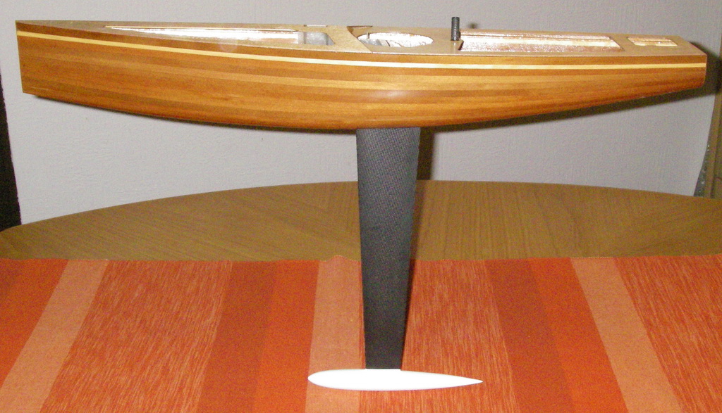 Der Rumpf besteht aus 30 Planken Rotzedernholz mit dem Grundmass von 8 * 2,5 mm. Die weisse Leiste ist aus Kiefer. Die Planken werden mit Hilfe einer Schablone am Bug und gegen das Heck verjüngt, so dass eigentlich alle Planken die gleiche Form haben und durchgehend sind. Verleimt habe ich alles mit normalem Holzleim. Nachdem der Rumpf sauber geschliffen wurde, habe ich ein feines 49er Glasgewebe aufgebracht und nach dem Aushärten nochmals mit einer Schicht Epoxy versehen. Damit alles UV-Beständig ist, kommt noch ein Polyurethane-Klarlack drauf. Die Innenseite habe ich ebenfalls mit Epoxy versiegelt. Der Hauptspant beim Kiel verblieb als einziger im Boot.