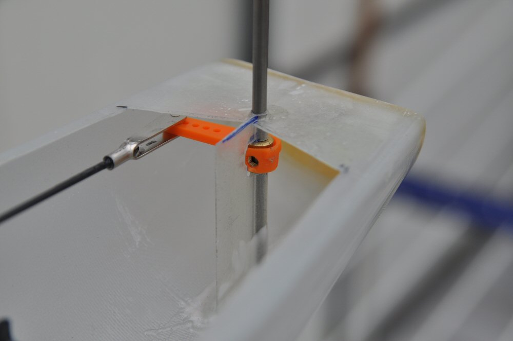 Da ich ein kpl. neues Boot wollte,mußten auch neue Riggs und Segel her.A-und B-Segel habe ich diesmal nach dem Schnitt von Andy Hoffmann angefertigt.Bei den Riggs habe ich mich von dem Bericht in Andys Blog inspirieren lassen,also mit Babybaum.Aber als Babybaum wurde kein Sandwichmaterial genommen,sondern ein 4mm 4kt.-CFKrohr.Sehr stabil und filigran.Zum Einstellen passen die Gummis für Servobefestigung.
